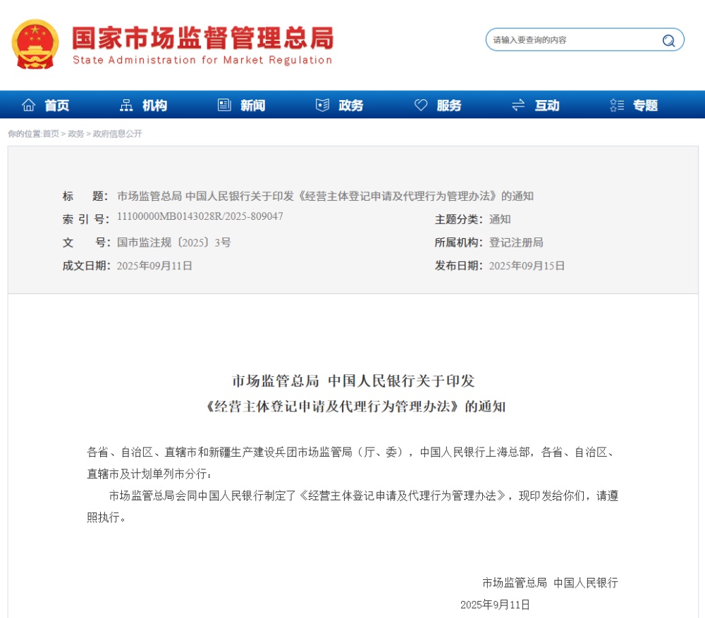 国家监管中国人民银行的国家监管通知就发布了“有关业务主题的应用和代理行为的管理法规”市场监督局(部门,委员会),直接在中央政府和新疆生产和建筑兵团下的所有省份,自治地区,市政当局,全民公司,全部自动属于中国省份,各个省份的县,在中央政府和具有独立规划状态的市政当局下:市场法规的州管理已在中国联合表达了“应用程序管理法规和进行业务主题”,现在向您发出,请遵循。国家监管州政府中国人民银行2025年9月11日(该文件公开发布)管理业务实体注册申请和代理法案的管理措施1一般条款第1条为了优化业务环境,标准化注册申请和代理行为,防止虚假注册,加强和标准化反货币洗钱工作,提高注册质量,并有效地保护这些提议的合法权利和利益,这些提案是根据“中国人民共和国法律”法律制定的。 “中华人民共和国的反咨询网络欺诈法”,“对中华民国人民主题的监管和管理的法规”和其他行政法律法规。第2条在这些步骤中规定的商业实体机构的应用和业务机构的行为是指适用于权威机构的业务实体的行为,用于注册和提交商业实体问题指定的代表或授权代理。这些步骤中指定的注册注册官是指企业实体任命的内部人员或指定代表业务实体来处理对象的注册和提交对象的内部人员。注册官员必须根据法律向注册机构提交记录。这些步骤中提到的业务实体注册和注册代理(因此称为注册代理)是指具有专业的注册和注册知识,直接接受业务实体的第三方或个人机构,以及专门处理注册和商业机构的机构的员工。第3条针对市场监管和管理的国家管理负责注册和管理国家业务生物,并管理和监督注册和进行机构的申请国家注册官员和注册代理商;负责开发国家业务实体注册和注册代理系统的注册,记录和收集并披露国家注册代理,相关机构,从业人员,代理商业务的领导者以及被限制申请注册业务实体的人的相关信息。县级或以上的地方政府的部门(因此从称为注册机构)必须管理和管理其所在地区的OP机构注册和注册机构的应用。第2章第4条提交申请标准的第4条如果运营实体适用注册,则可以将注册注册官员提交注册机构申请,或者注册代理可以将注册申请委托提交注册申请n授权申请的名称。第5条注册官和注册代理必须根据国家管理层对市场监管产生的注册文件和材料规格提交注册申请材料,并与注册机构合作以进行名称注册确认。 PAG -Uuthe注册和持有注册机构工作的人的官员已有18岁以上,并且具有满足的民用能力。注册代理不应担任业务实体注册注册的官员,并且注册代理应在其通用业务实体中建立资金。在接受注册申请时,注册机构必须加强联络官注册验证和登记册的真实姓名。注册官员提供的手机号码和注册的注册代理权威是按照真实人的姓名注册的电话号码。第6条注册官员或注册代理在向Pagareh注册表提交申请时必须发表诚信声明,并保证他的代理机构的行为被企业实体允许或委托,并且不会提供不正确的信息和材料。 Chapter 3 Article 7 of the Registered Information Information Agent 7 The registered agent should indicate its agent identity through the National Business Entity Registration and Registration Agent Information System and provide the following information on the register: (1) the information to the registered agent, including the identity or institution of the qualification, communication, and the information of the person in charge of an individual, institution, institution, institution, institutional, institutional, institution, institution, institution, institution, institution,机构,机构,研究所在机构,机构,机构,机构,机构,机构,机构,机构,机构,机构,机构,机构,机构,机构,机构,机构,机构,机构,机构,机构,机构,机构,机构,机构,机构,机构,机构,机构,机构,机构,机构,机构,机构,机构,机构,机构,机构,以及; 。 。如果上述信息更改,则注册代理将在信息更改之日起60天内立即更新信息。第8条省级市场和行政部门拥有PIT是有责任收集以下注册代理的信息,并立即将其总结为国家管理和市场管理:(1)信息代理的信息和业务应用程序代理在该领域记录的信息; 。 (3)注册代理的信息受到行政处罚; (4)有关寄存器的信息D代理人包括异常业务运营清单或严重违规和违反信任的列表; (5)国家管理和市场管理和管理设置的其他信息。第4章第9条注册代理行为代码第9条注册代理必须根据以下规范参与该机构的行为:(1)符合法律和法规并遵守国家法规,遵守忠诚度和地图原则。 。与相关部门合作,以避免损失金钱和恐怖筹集资金,避免和调查不正确的注册等; )。 。根据标准形式和法律程序,向真实和全面的注册申请提交注册申请; (vi)参与当前注册注册的相关人员调整身份验证,查看身份证明或证书在受试者的资格中,确保主题的身份证明或资格是真实的,并帮助他们与注册机构合作以完成真实姓名登记册的确认; (7)建立注册机构培训票据,记录技能状况是正确的,并与Thangedan,代理服务合同和其他材料正确保持记录; 。第10条如果一个运营实体参与收入注册机构的活动,则必须对这些步骤的第9条中的注册代理执行适当的要求,并根据以下标准进行业务活动:(1)积极地表明注册代理人对本金,并在本性的电话号码和其他合理方式中对本金和明显的收费标准,管理和其他有理方式的管理标准和投诉; 。第11条注册代理必须遵守有关保护商业机密和个人I的相关规定